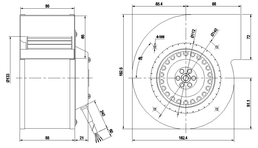 | VAC | Hz | A | W | r/min | m³/min | Pa | dB(A) | uF/V | kg | |||||